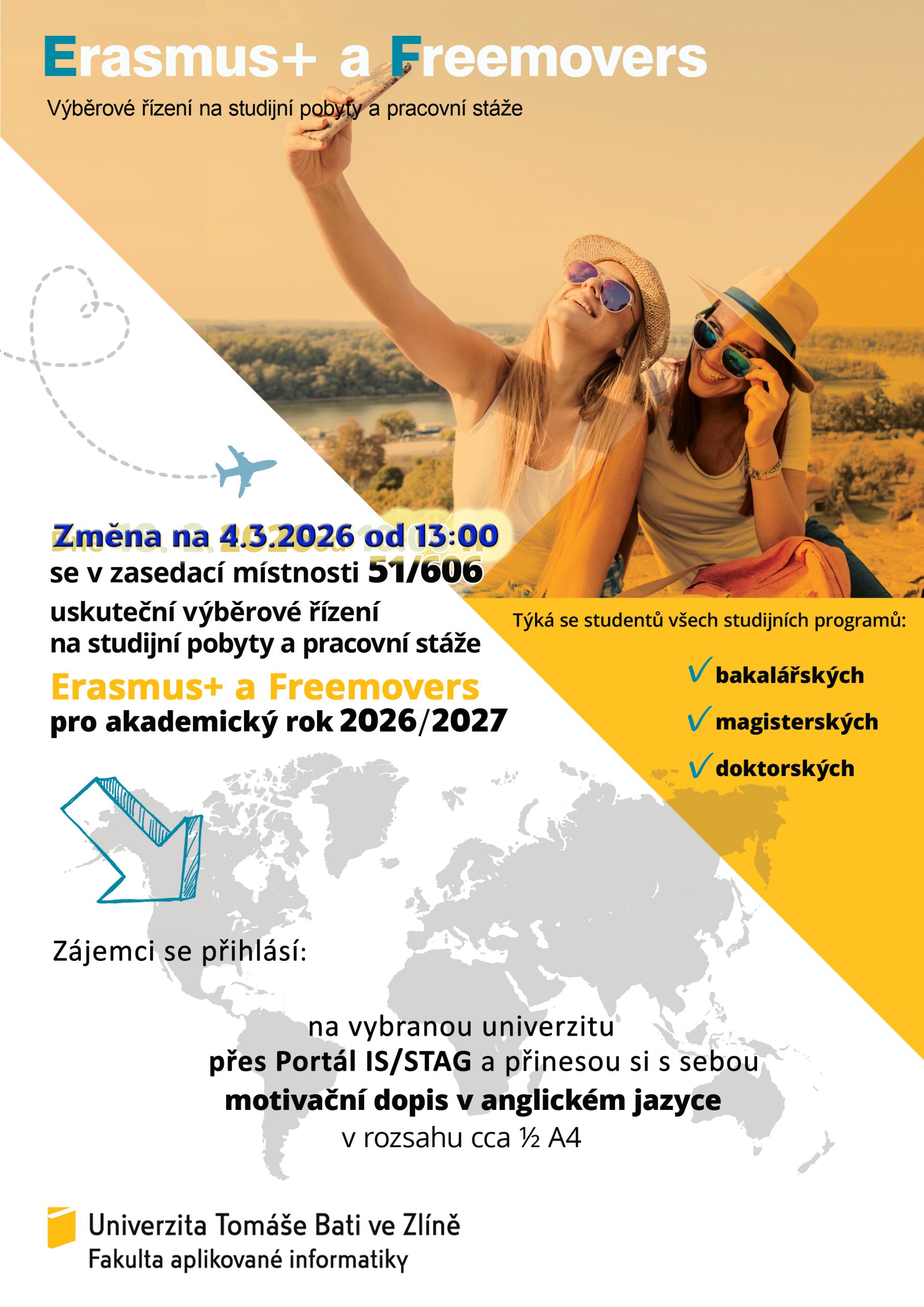 Ve středu 4. 3. 2026 od 13 hodin se v místnosti 51/606 uskuteční výběrové řízení na studijní pobyty a praktické stáže Erasmus+ a Freemovers pro akademický rok 2026/2027.